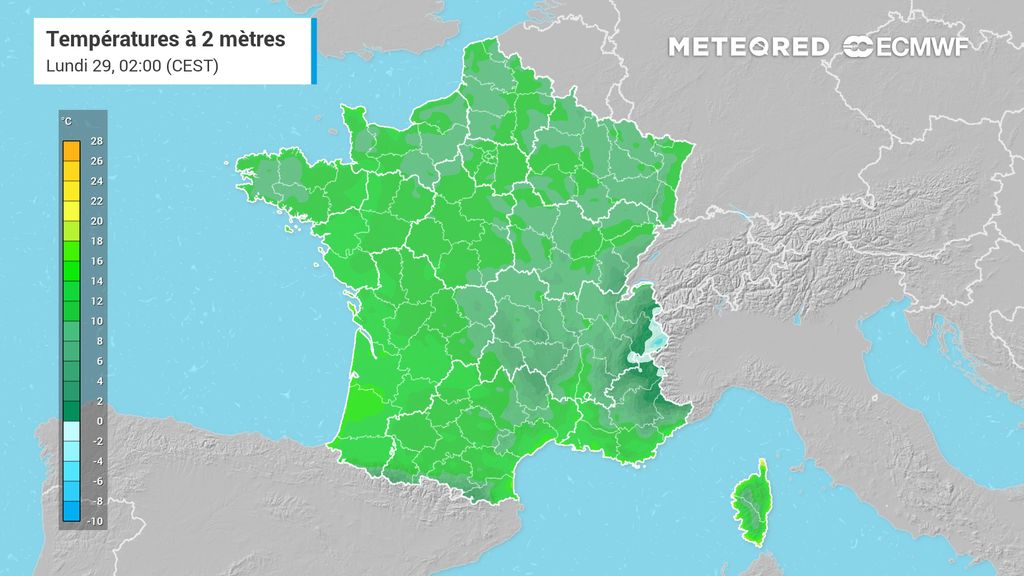 Les 20°C devraient être atteints voire dépassés aussi bien au nord qu'au sud. La barre des 25°C pourrait même être atteinte dans un bon quart sud-ouest et possiblement très localement un peu plus en remontant au nord.