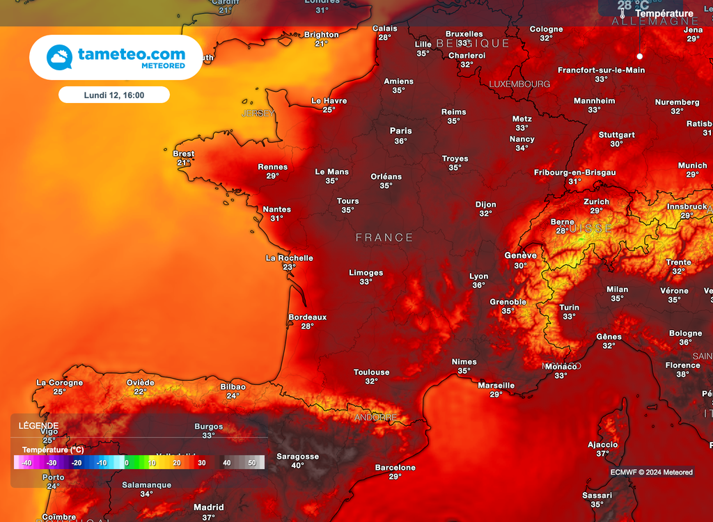 Déjà en hausse ce dimanche, le thermomètre va poursuivre sa montée demain lundi, surtout sur la moitié nord de la France. On pourra par exemple mesurer jusqu'à 36°C du côté de Paris, 35°C sur Lille, Amiens, Le Mans, Orléans ou bien encore Tours et Nîmes.