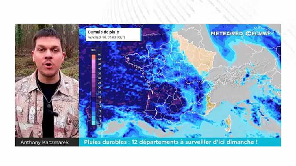 C'est donc dans cette zone qu'il pleuvra le plus, avec généralement entre 30 et 50 litres d'eau par mètre carré en trois jours, localement davantage, et également beaucoup de neige attendue en montagne, sur les Pyrénées et le Massif Central, où d'ailleurs le risque de coulées de neige sera important et particulièrement à surveiller. Les régions méditerranéennes et les Hauts-de-France devraient en revanche être les moins arrosées pendant cette période.