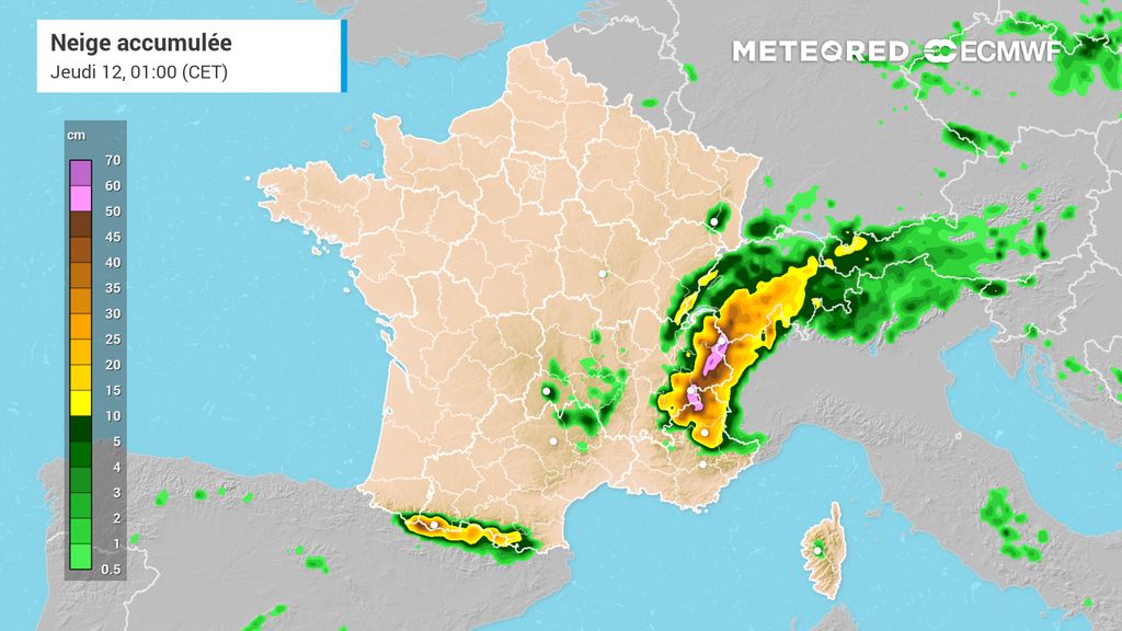 Dans le flux de nord, la perturbation viendra aussi se bloquer au pied des Pyrénées avec de la neige à très basse altitude sur le piémont.
