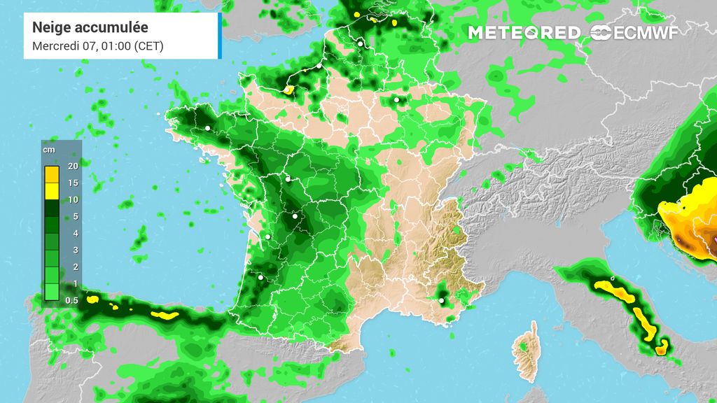 Si elle donnera de la pluie entre la Bretagne et la côte normande, la neige prendra le dessus dans les terres en raison de la résistance de l'air froid. Il faut ainsi s'attendre à un épisode neigeux en cours de journée entre le val de Loire et le Grand Est, en passant par les Hauts-de-France, la région parisienne ou encore la Bourgogne. Les quantités et la chronologie exactes restent encore à définir. Les températures commenceront à remonter dans l'ouest alors que des valeurs proches de -10°C seront toujours possibles plus à l'est.
