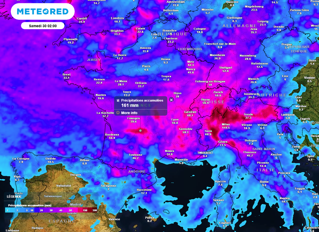 Entre mercredi et jeudi, une dégradation pluvio-orageuse active est attendue du sud-ouest au centre-est avec un risque de cumuls de pluie significatifs parfois supérieurs à 50/60 mm selon les modèles d'ensemble.