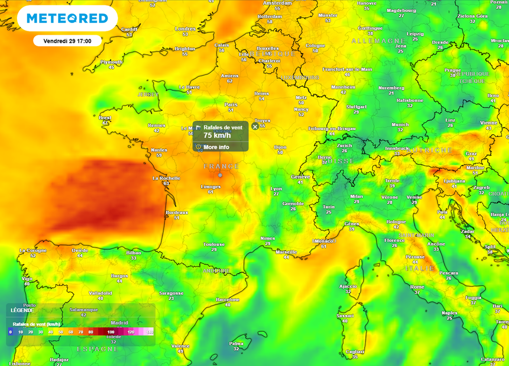Vendredi, une nouvelle perturbation très active abordera l'ouest du pays. Elle sera directement liée à l'ex-ouragan Erin. Elle s'accompagnera de pluies soutenues et de vents forts, jusqu'à 80 km/h dans l'intérieur des terres et près de 100 km/h sur le littoral atlantique. Avant l'arrivée du front en soirée, les régions plus à l'est profiteront de conditions temporairement plus agréables avec de belles éclaircies au programme.