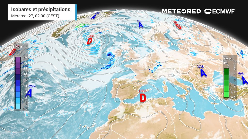 La nuit suivante et au cours de la journée de jeudi, l'axe pluvio-orageux se décalera vers l'est, en touchant également les régions méditerranéennes. Là encore, les cumuls de précipitations seront à surveiller car ils s'annoncent conséquents. Des inondations ne sont pas exclues localement, des pointes à 100 mm étant envisagées par certains modèles de prévision. Les autres régions connaîtront une météo hésitante, entre nuages, éclaircies et petites averses. La baisse des températures se poursuivra.