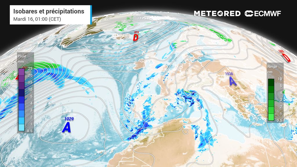 Des pluies vont donc se mettre en place dans le sud-est de l'hexagone (mais aussi sur les Pyrénées avec de la neige en altitude). Quelques pluies ausis de prévues lundi sur le Finistère.