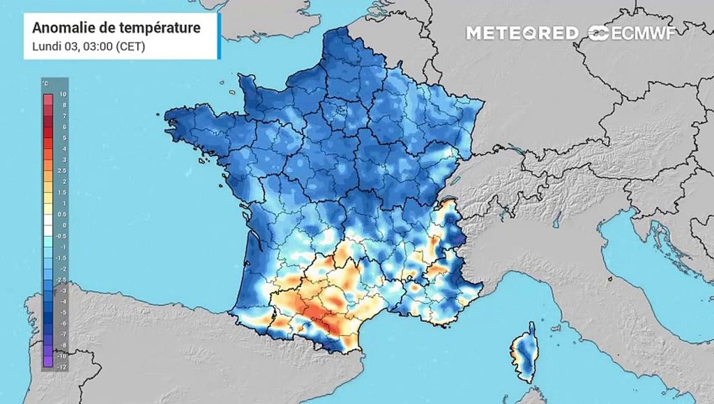 Dans le même temps, une goutte froide présente sur l'Espagne provoque des conditions météo plus mitigées sur l'extrême sud de la France, notamment sur le Languedoc-Roussillon et les Pyrénées.