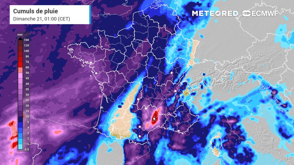 De nouvelles remontées humides intéresseront le quart sud-est pour votre journée de dimanche. Celles-ci auront pour effet d'engendrer des cumuls de pluies conséquents, probablement plus de 30-40mm dans les plaines et jusqu'à 100mm voire plus en direction des Cévennes.