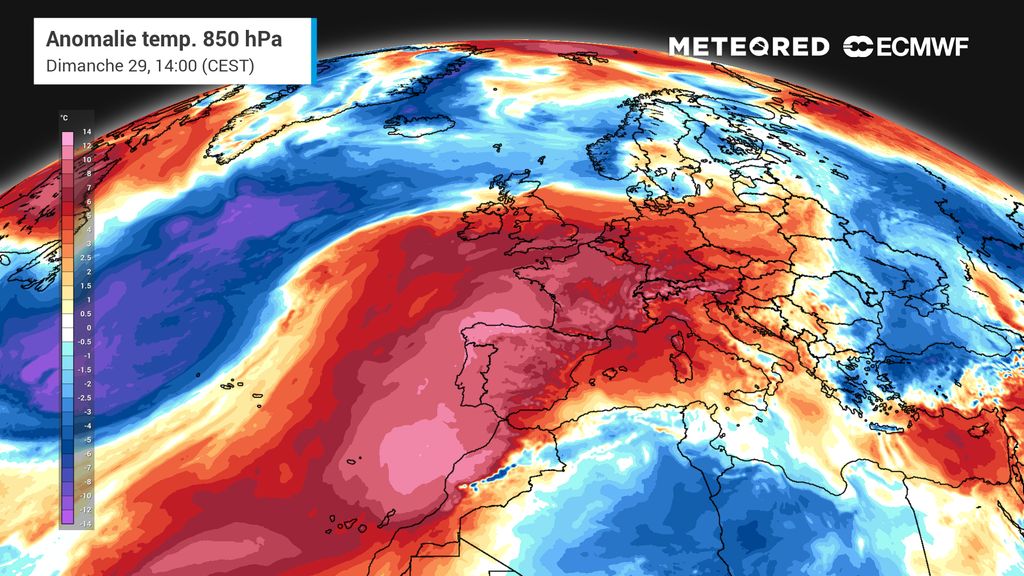 En début de semaine prochaine, les valeurs pourraient même approcher la barre des 40 °C jusqu’au nord du pays ! Il est par exemple prévu 38 °C à Paris mardi après-midi et 40 °C à Bordeaux, selon le modèle européen.