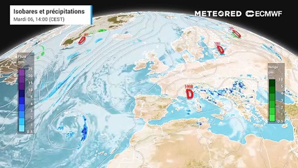En revanche, et comme le montre la carte ci-dessous, le sud du pays est sous l’influence de conditions météorologiques dépressionnaires présentes en Méditerranée. Cette partie de l’Hexagone est donc soumise à un temps beaucoup plus perturbé et humide.