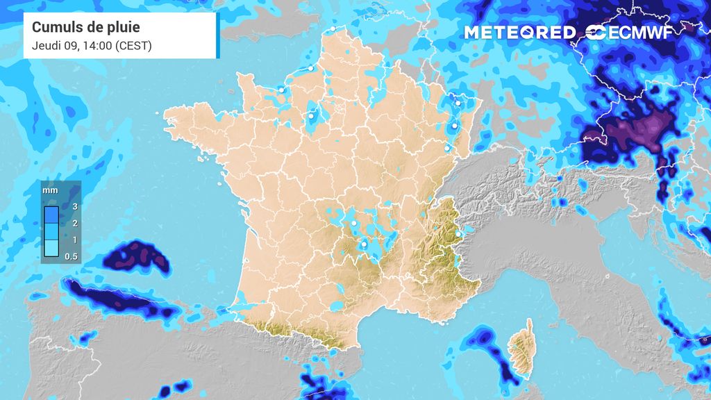 Un très léger changement de temps se confirme pour jeudi avec l’arrivée d’une perturbation très atténuée sur le pays. Elle apportera un ciel couvert et quelques pluies très localisées et faibles entre le sud-ouest et le nord-est de la France. Des averses orageuses sont également envisagées pour cette journée sur le sud de la Corse.