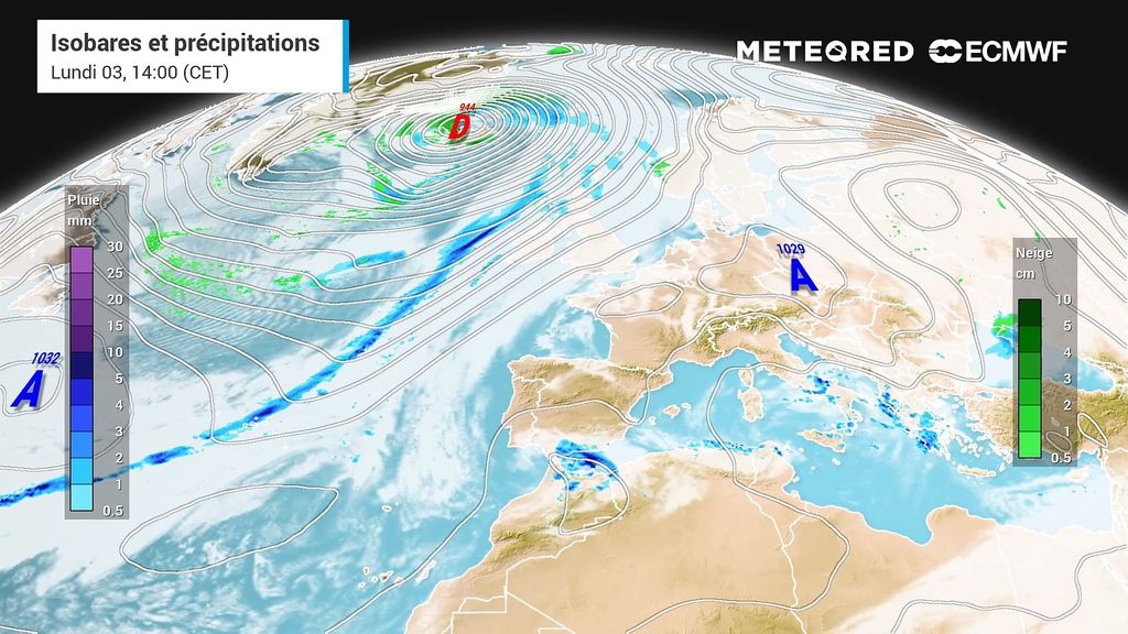 Cependant, malgré les pressions anticycloniques sur la France, une perturbation très atténuée va aborder la Bretagne au cours des prochaines heures. Il s'agit d'un front froid qui n'apportera que très peu de précipitations.