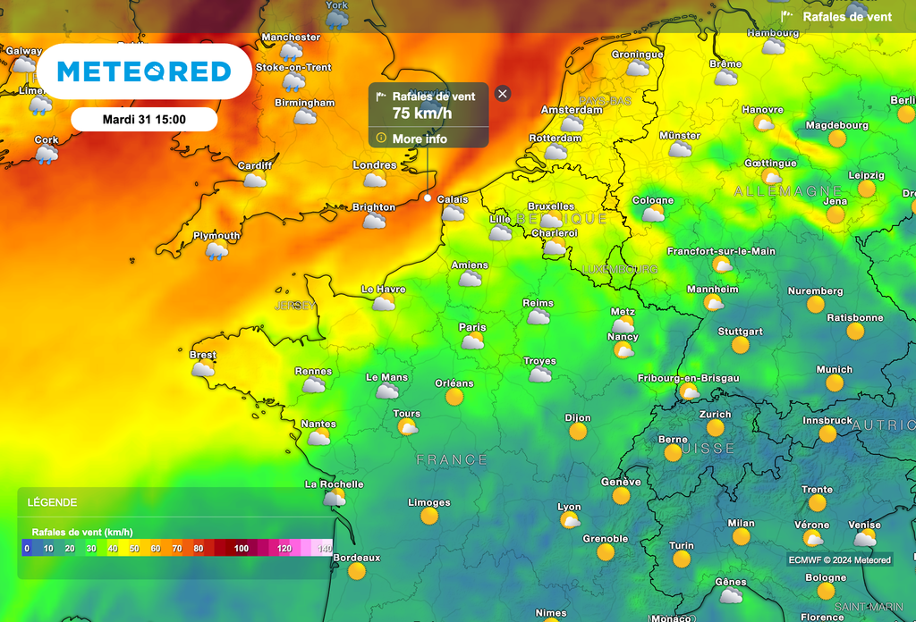Le vent devrait surtout souffler fort mercredi le long des côtes de la Manche, avec des rafales proches de 80 à 90 km/h, voire ponctuellement 100 km/h. Dans les terres, les rafales s'annoncent beaucoup moins fortes, atteignant 50 à 60 km/h.