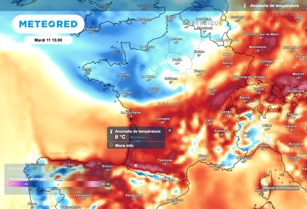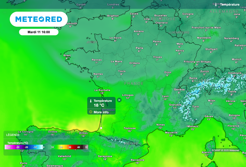 Demain après-midi, des températures très douces pour la saison sont attendues dans le sud-ouest avec 16°C à Bordeaux et Toulouse et 18°C à Biarritz. Localement, des pointes à près de 20 degrés sont possibles au pied des Pyrénées.