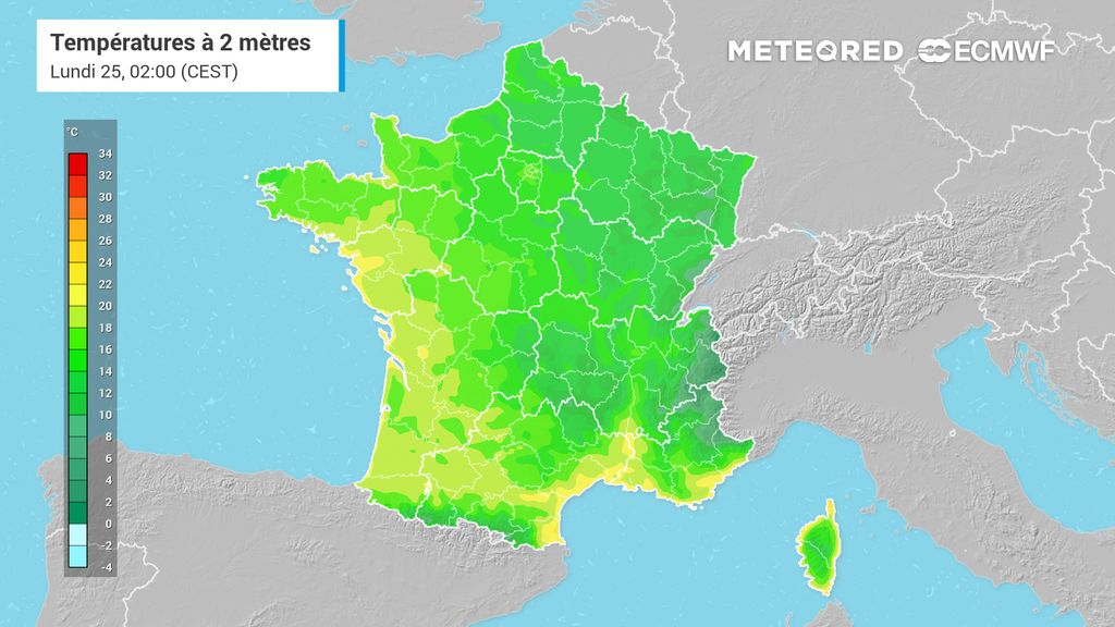 Ailleurs en France, les températures s'annoncent relativement homogènes. Il est prévu entre 12 et 14°C. Des températures plus douces encore sur la côte Atlantique avec des minimales pouvant être de l'ordre des 16-17°C. Près de la grande bleue, les valeurs pourront déjà approcher les 20°C voire localement les dépasser sur le littoral.