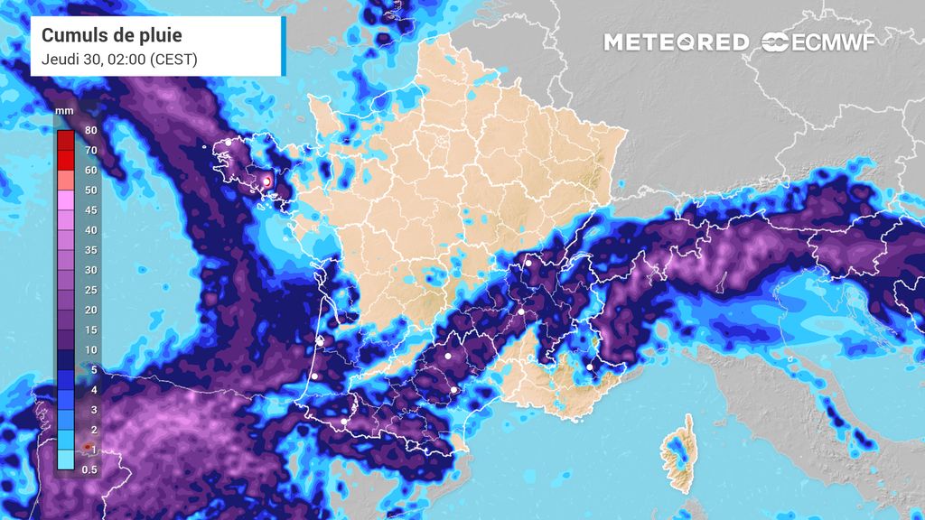 L'instabilité se renforce néanmoins cet après-midi avec des averses devenant orageuses sur l'ouest de l'Occitanie et sur le sud du Massif Central dès le début d'après-midi, se décalant ensuite peu à peu vers le nord des Alpes, le val de Saône, le sud de la Bourgogne et le Jura d'ici la fin de journée. Ces orages pourront se montrer localement actifs, s'accompagnant notamment de fortes précipitations temporaires, de chutes de grêle localisées et de rafales de vent soudaines.