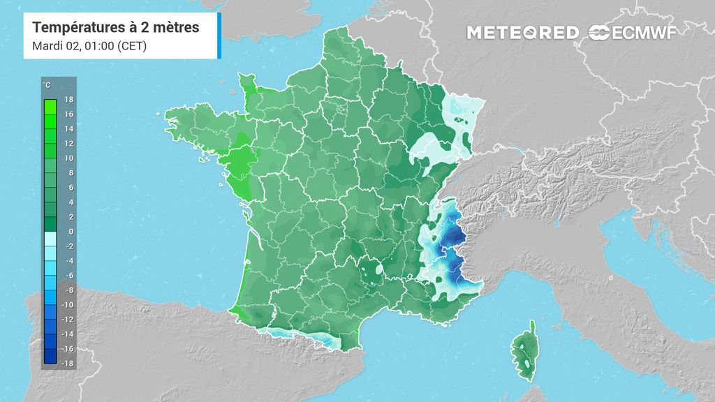 Il est prévu ce matin -3°C à Aurillac, -2°C à Strasbourg, Nancy, Reims et Dijon, -1°C à Clermont-Ferrand et Limoges, 0°C à Auxerre, Bourges et Poitiers, 1°C à Bordeaux, Biarritz et Montpellier, 2°C à Lille, 4°C à Nantes et Paris, 5°C à Marseille, 7°C à Brest et 9°C à Nice et Ajaccio.