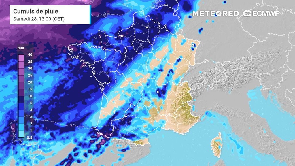 La pluie abordera en réalité la pointe bretonne dès le milieu de la nuit prochaine selon le modèle européen. En tout début de matinée, vers 7 heures, la perturbation apportera quelques pluies entre le Morbihan, la Loire-Atlantique et les côtes normandes.