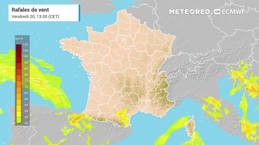 Le modèle européen prévoit des rafales de vent proches de 100 à 110 km/h, notamment sur le relief exposé.