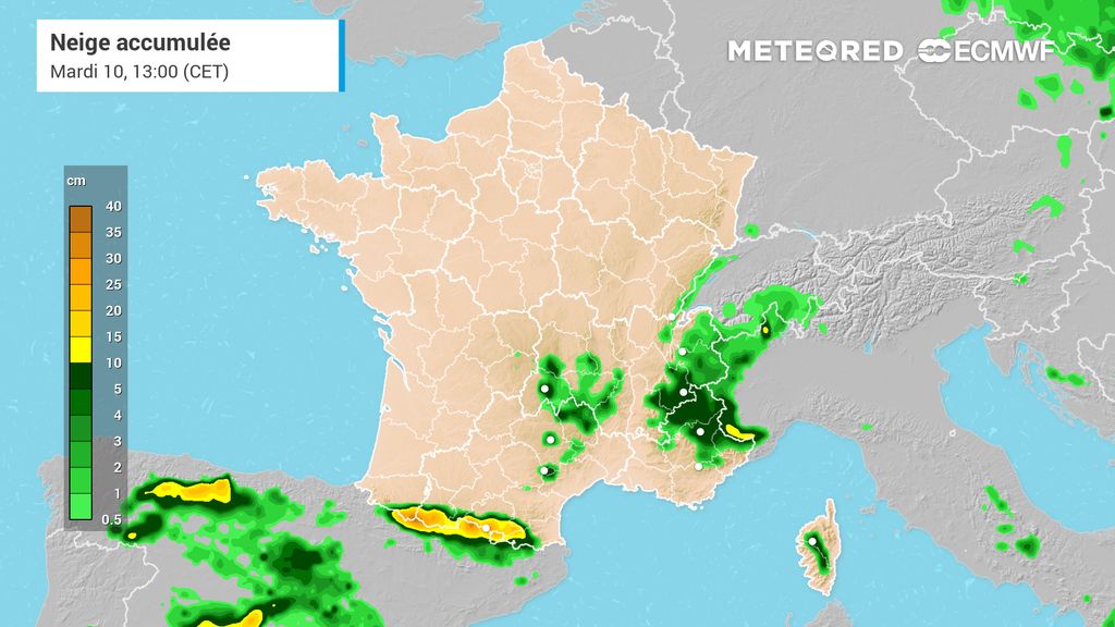 Les Alpes seront les mieux loties : 20 à 50cm de manière étendue, jusqu'à un mètre de neige sur les hauteurs de l'Isère, de la Savoie et de la Haute-Savoie. Certaines prévisions brutes annoncent entre 1m et 1m20 de neige dans les secteurs de Chamonix-Mont-Blanc, Megève ou encore Les Arcs. Les Alpes-Maritimes seront en revanche moins favorisées.