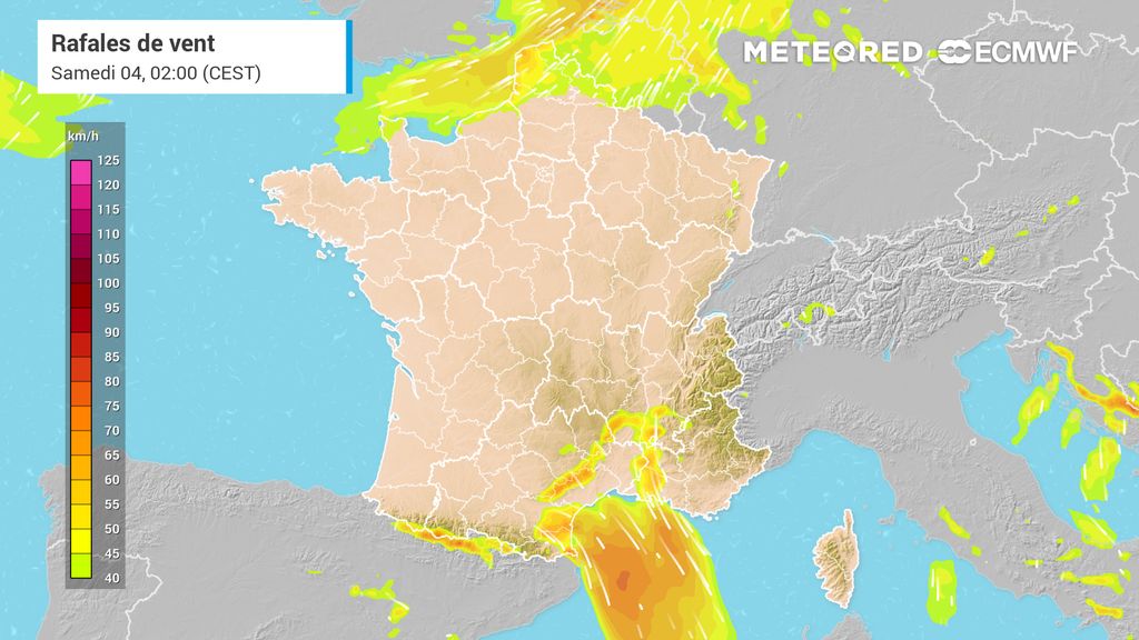 Si le soleil brille près de la Méditerranée, les vents sont également très forts. Des rafales parfois supérieures à 100 km/h sont une nouvelle fois attendues dans le domaine de la tramontane. Le mistral souffle également très fort avec des rafales proches de 100 km/h.