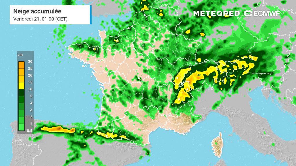 Le risque d'averses diminuera pour la journée de vendredi, se concentrant essentiellement sur tous les reliefs et à leurs abords immédiats. Quelques-unes resteront également possibles en bord de Manche, une situation assez classique avec un flux polaire maritime. Si les cumuls resteront limités en plaine, les montagnes vont recevoir de belles quantités d'or blanc ces prochains jours avec de 30 à 40 cm possibles sur les Alpes et les Pyrénées et jusqu'à 20 cm pour les autres reliefs.
