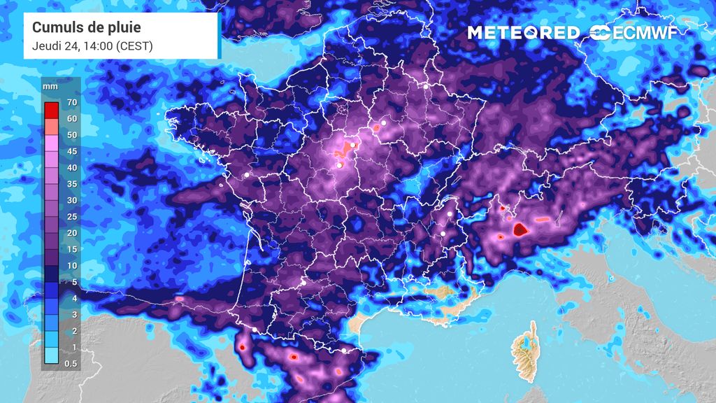 En journée, la perturbation continuera de glisser vers les régions centrales et de l’est, accompagnée d’orages parfois forts et de pluies soutenues. Sous la perturbation et les orages les plus intenses, les cumuls de pluie pourraient s’avérer importants, provoquant des ruissellements voire des inondations. Il conviendra de surveiller l’évolution de la vigilance météorologique au cours des prochaines heures.