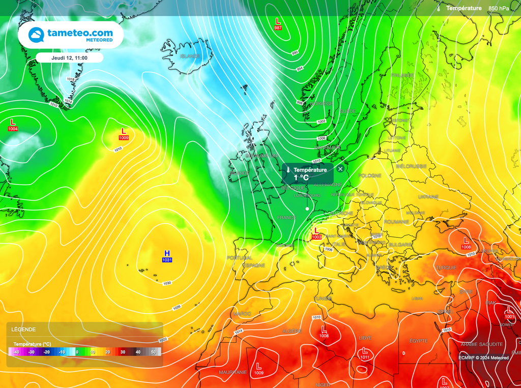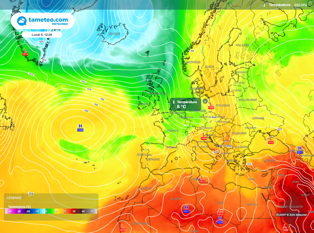 En effet, nous allons retrouver un anticyclone des Açores près des.. Açores. Un flux de secteur nord à nord-ouest pourra alors être présent sur l'hexagone. De plus, une dépression positionnée en Allemagne accentuera ce flux, faisant baisser les températures.