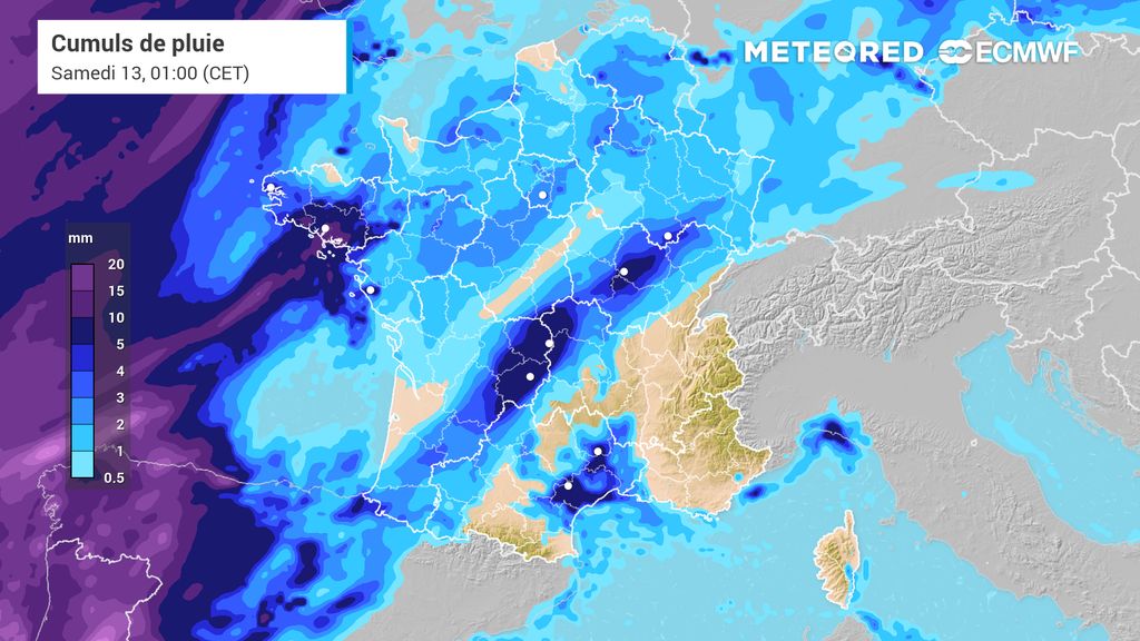 À son passage, il faut s'attendre à des cumuls de pluie de l'ordre de 10 à 15 mm sur une grande partie de la Nouvelle-Aquitaine et du Centre-Val de Loire, le nord-ouest de la Bourgogne, la Champagne-Ardenne et une partie de la Lorraine. Quelques averses se déclencheront à l'arrière, apportant quelques millimètres localement. Pendant ce temps, un vent de sud-est fera remonter des nuages et des pluies depuis la Méditerranée en direction du Languedoc.