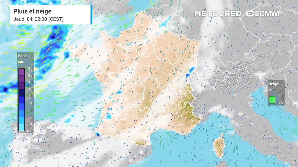Le front pluvieux gagnera les Pays-de-la-Loire et la Normandie au fil des heures, en perdant progressivement de son activité. Il finira par se disloquer à mesure qu'il progressera en direction du nord-est. Les quantités de pluies attendues durant cette journée seront généralement d'une dizaine de millimètres, voire davantage entre la Bretagne et le Cotentin. Dans ces régions, les cumuls durant ces deux journées pourront atteindre localement 30 à 35 mm.