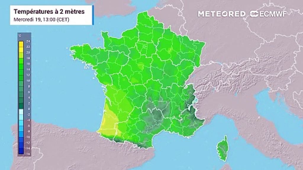 Déjà ce mercredi après-midi, plus de 14 à 16°C sont attendus sur la moitié nord. Des valeurs déjà supérieures aux normales. À l'inverse, sous les nuages présents en direction des Pyrénées Orientales, les températures maximales pourraient atteindre "seulement" 14°C du côté de Perpignan.