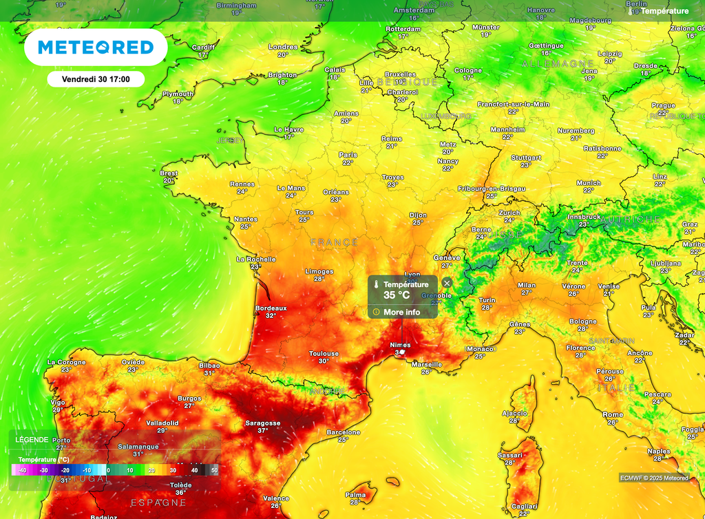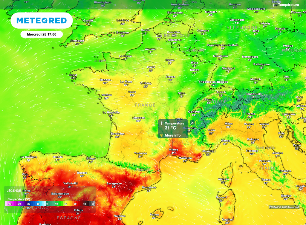 De fait, on pourra observer plus de 30°C sur Bordeaux et Toulouse. Dans les Landes, les 34°C sont envisageables. Le seuil de très fortes chaleurs (35°C) risque d'être atteint dans le Gard et plus largement sur les départements bordant la mer Méditerranée.