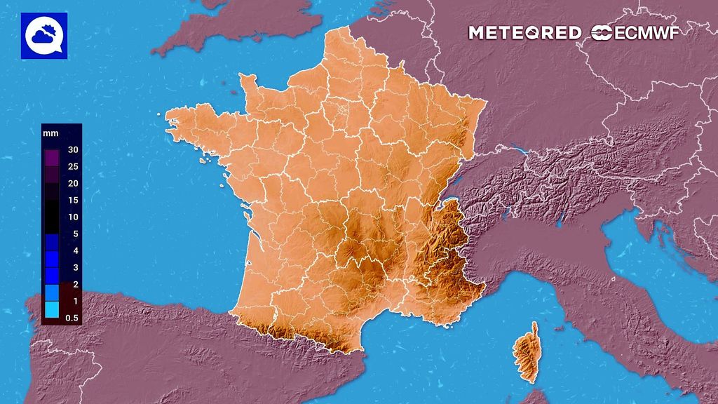 Plus précisément, aucune goutte de pluie n'est attendue de la côte atlantique au quart nord-est du pays et en redescendant vers la Bourgogne-Franche-Comté. Seules les zones de reliefs méridionaux recevront des pluies avec des cumuls irréguliers au gré des cellules orageuses. Ces dernières déborderont localement sur les plaines environnantes.