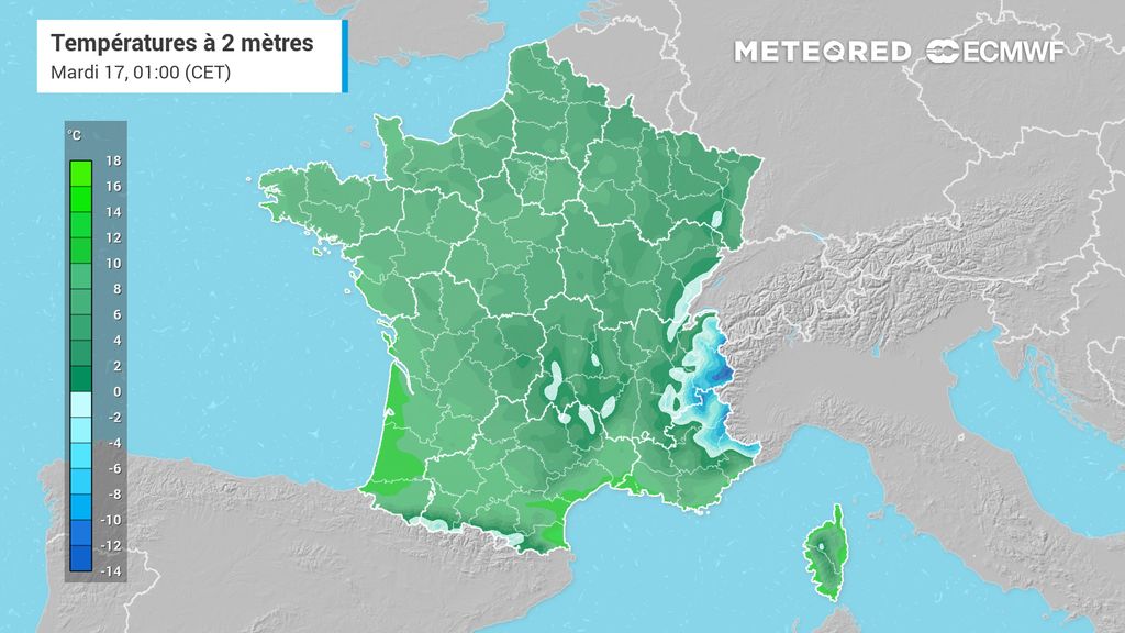 Sur la façade atlantique, les températures seront un peu plus douces. Comptez notamment 12°C sur Nantes et La Rochelle mais jusqu'à 14°C en région bordelaise. En Occitanie aussi la douceur sera bien présente : 14°C sur Toulouse et même 16°C à Nîmes. Douceur bien installée sur l'ensemble du pourtour méditerranéen. Jusqu'à 19°C du côté de Monaco.