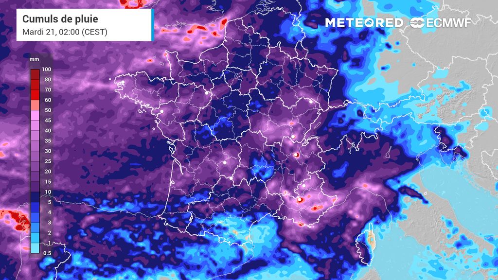Près de l'Atlantique et dans les régions frontalières du Nord-Est, des cumuls de 50 à 60 mm seront légion. Vers les Vosges, le Jura, le Nord des Alpes, la Gironde et le Boulonnais, on se rapprochera localement des 100 litres d'eau par m². Enfin, c'est dans le Centre-Ouest que la situation sera la plus risquée, avec des modélisations jusqu'à 150 mm vers le Limousin et l'Ouest du Massif Central.