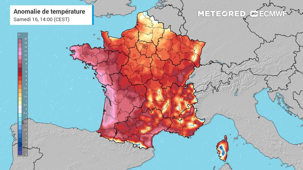 Il est prévu cet après-midi 25 °C à Cherbourg, 27 °C à Caen, 28 °C à Brest, 30 °C à Lille, 32 °C à Paris et Ajaccio, 33 °C à Nice, 34 °C à Mulhouse et Nantes, 35 °C à Strasbourg, Aurillac et Bastia, 36 °C à Lyon, 37 °C à Dijon, Bourges et Tarbes, 38 °C à Limoges et Montpellier, 39 °C à Montauban, Toulouse et Biarritz, et 40 °C à Auch, Agen et Bordeaux.