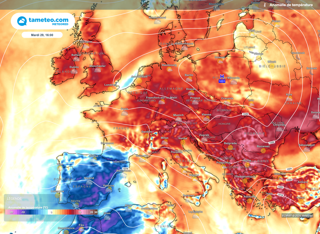 Cet anticyclone s'annonce vigoureux puisqu'il pourrait atteindre les 1035hPa voire les dépasser en direction de la Pologne. Fait marquant, ce n'est pas si souvent que l'on aura eu des pressions si élevées à proximité de la France après une année très pluvieuse.