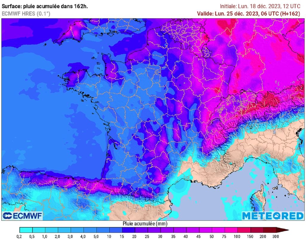 D’ici samedi et donc le début du week-end de Noël, les précipitations les plus nombreuses sont attendues sur les flancs des reliefs exposés à l’ouest et au nord-ouest tels que les Pyrénées, le Massif Central, les Alpes du Nord, le Jura, les Vosges, les Ardennes ou encore le Morvan. Pour ces secteurs, il faut s’attendre généralement à des cumuls de l’ordre de 50 à 70 mm, voire davantage à des altitudes plus élevées. En plaine, c’est dans le Grand Est, en Franche-Comté et dans les vallées alpines où les quantités les plus importantes sont attendues avec régulièrement une quarantaine de millimètres.