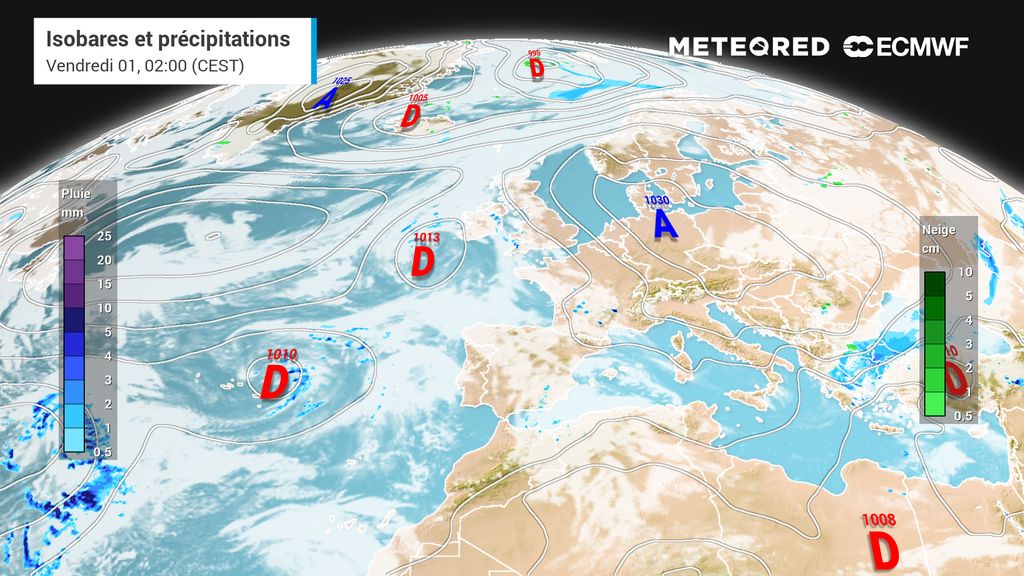 Samedi, le centre dépressionnaire devrait se situer à proximité des côtes vendéennes. Dans le même temps, une goutte froide sera toujours située au sud de l’Irlande.