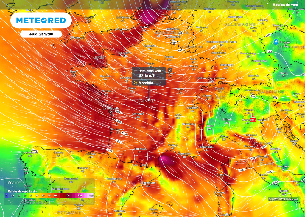 Le pic d'intensité de ce coup de vent devrait avoir lieu en cours d'après-midi et tout début de soirée de demain jeudi. Selon le modèle européen ECMWF, les rafales de vent risquent de frôler voire atteindre les 100km/h en régions centrales.
