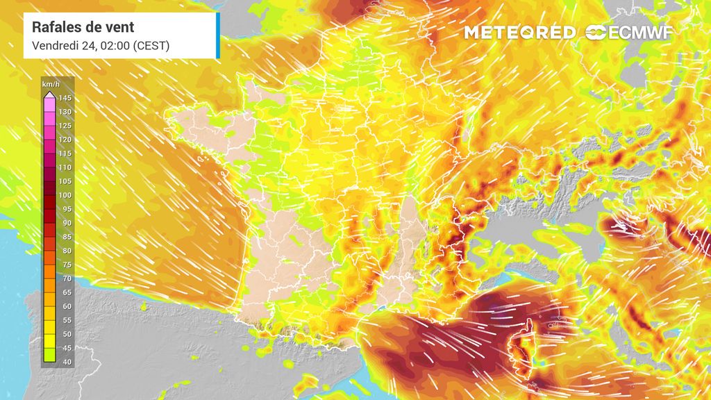 Localement, des averses voire orages pourront générer des rafales de 90km/h dans les terres. En direction des reliefs, la barre des 100km/h sera probablement rapidement atteinte voire dépassée.