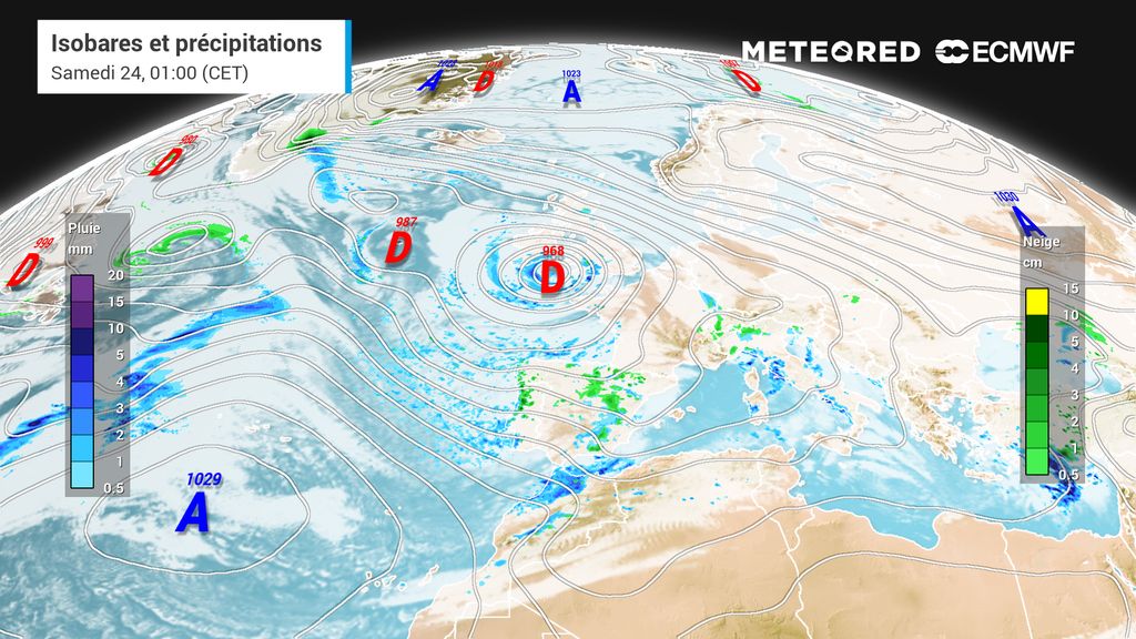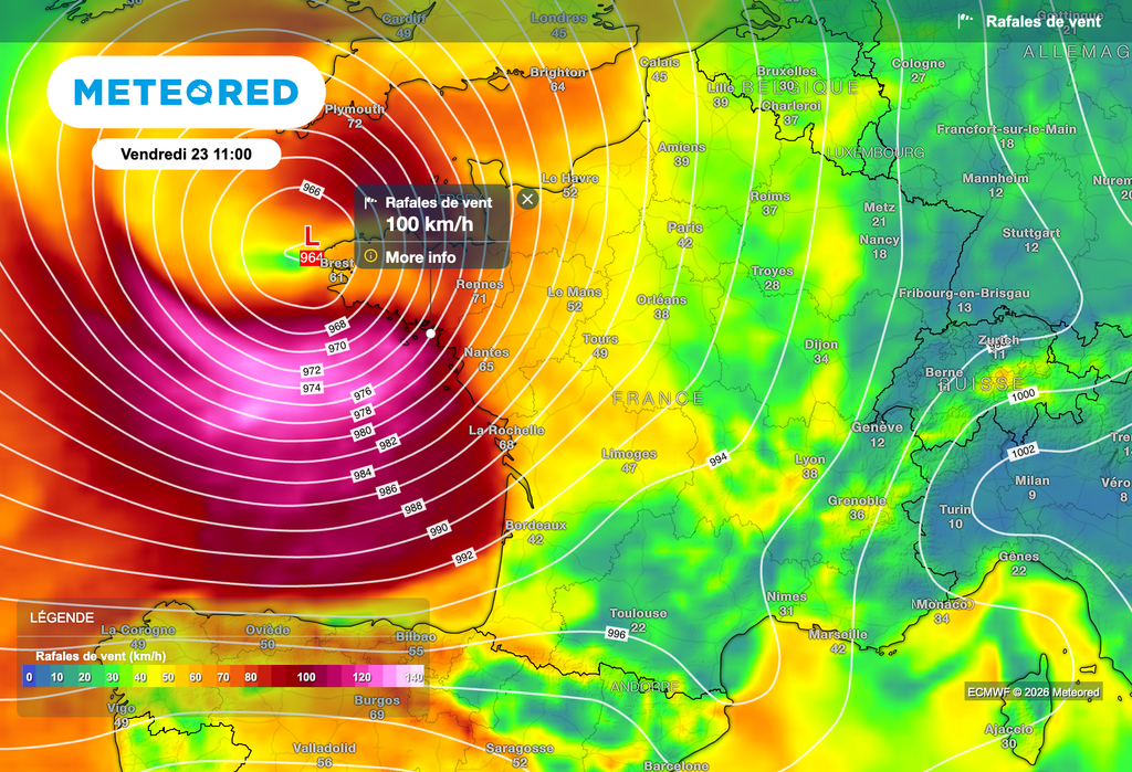 Cette dépression devrait aussi se creuser de manière extrêmement rapide. La pression pourrait chuter de près de 20 hPa en l’espace de seulement quelques heures. Il est encore difficile de dire à cette heure s’il s’agira d’un creusement explosif et si cette dépression sera une "bombe météorologique". En tout cas, il va falloir surveiller de près l’évolution de cette dépression, son creusement et sa trajectoire.
