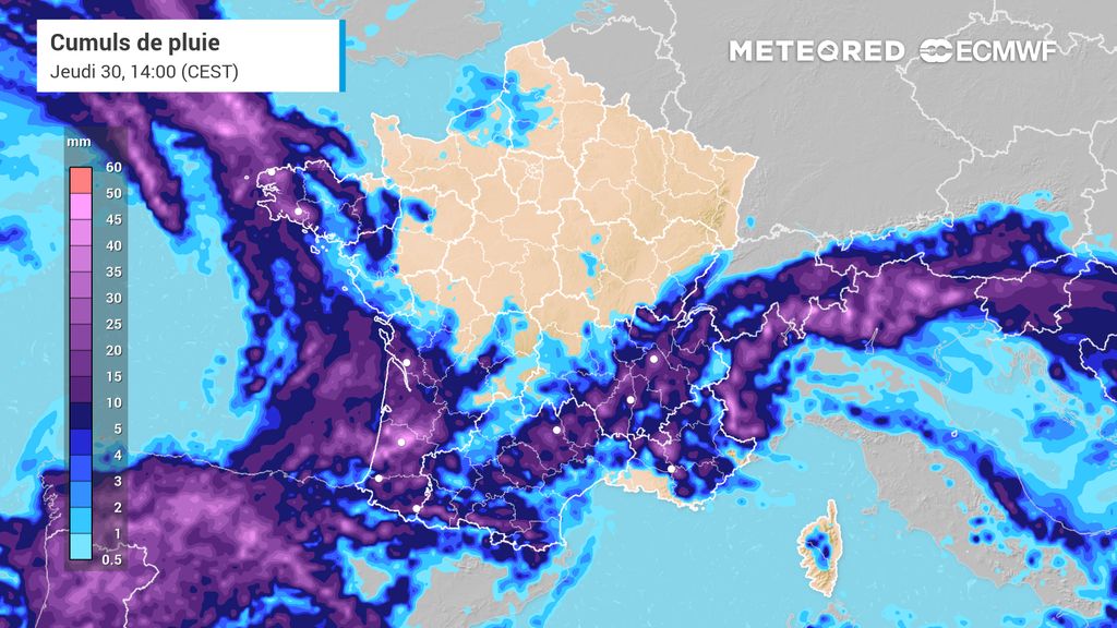 Elles se produiront principalement sous forme d'averses et lors du passage de cellules orageuses localement marquées. Plus au nord, les pluies seront un peu plus discrètes. Elles pourraient même être déficitaires entre la Bretagne et le nord de la Seine. Côté mercure, la douceur restera de mise avec des valeurs généralement situées 2 à 3°C au-dessus des normales de saison.