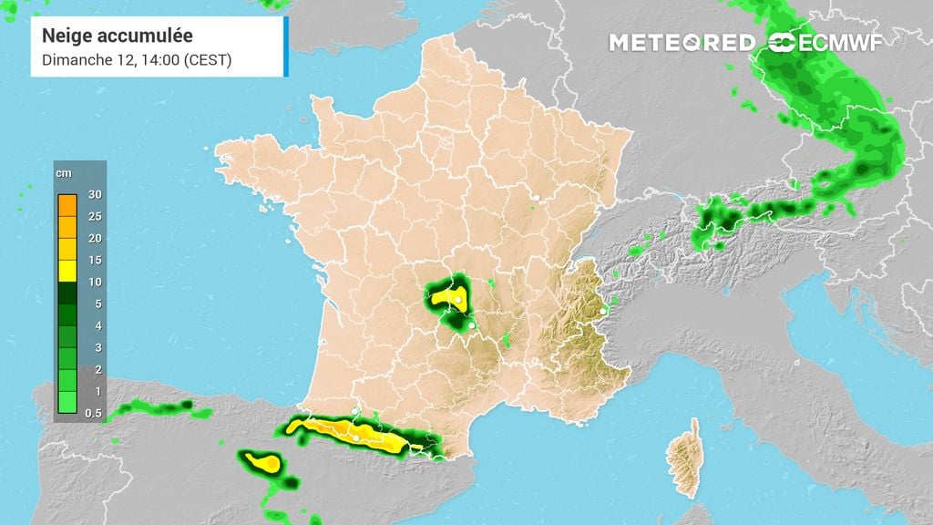 En termes de cumuls, il faut s'attendre dès la moyenne montagne à 15 à 30cm de neige fraîche d'ici lundi soir sur les Pyrénées et le Massif Central, 5 à 15cm sur les Alpes (un peu moins sur les Alpes du Sud), parfois bien davantage près de la frontière italienne (plus de 30 cm). Dans la journée de mardi, avec la remontée des températures, la neige ne tombera plus que sous forme d'averses, à plus haute altitude, uniquement sur les Alpes et les Pyrénées.