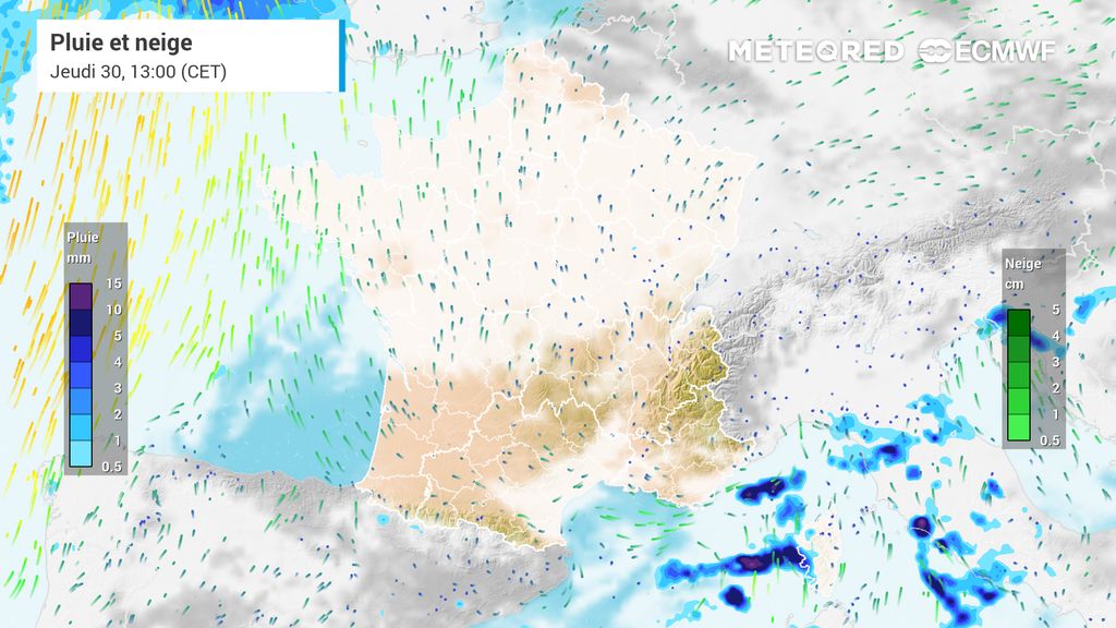 Ce flux à composante maritime fera, comme son nom l'indique, remonter de l'air humide et instable depuis la mer, ce qui favorisera la formation de pluies voire d'orages. Si ces orages se développent, ils seront parfois bien pluvieux, notamment entre le Languedoc, les Cévennes et le Var. Pendant ce temps-là, une perturbation classique traversera la France d'Ouest en Est, sous un air plus doux.