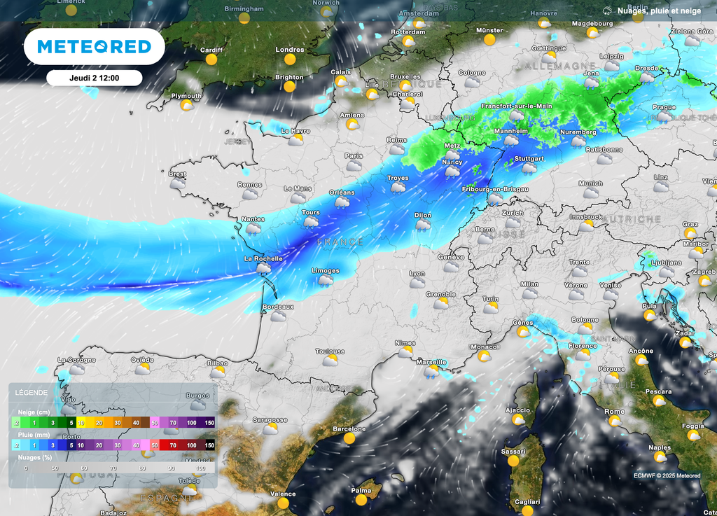 Dans un premier temps, elle apportera de la pluie mais d'ici le courant d'après-midi au plus tard (possiblement dès la fin de matinée), de l'air plus froid s'invitera. Cela pourra favoriser la présence de flocons voire de chutes de neige jusqu'en plaine entre Champagne-Ardenne et Alsace.