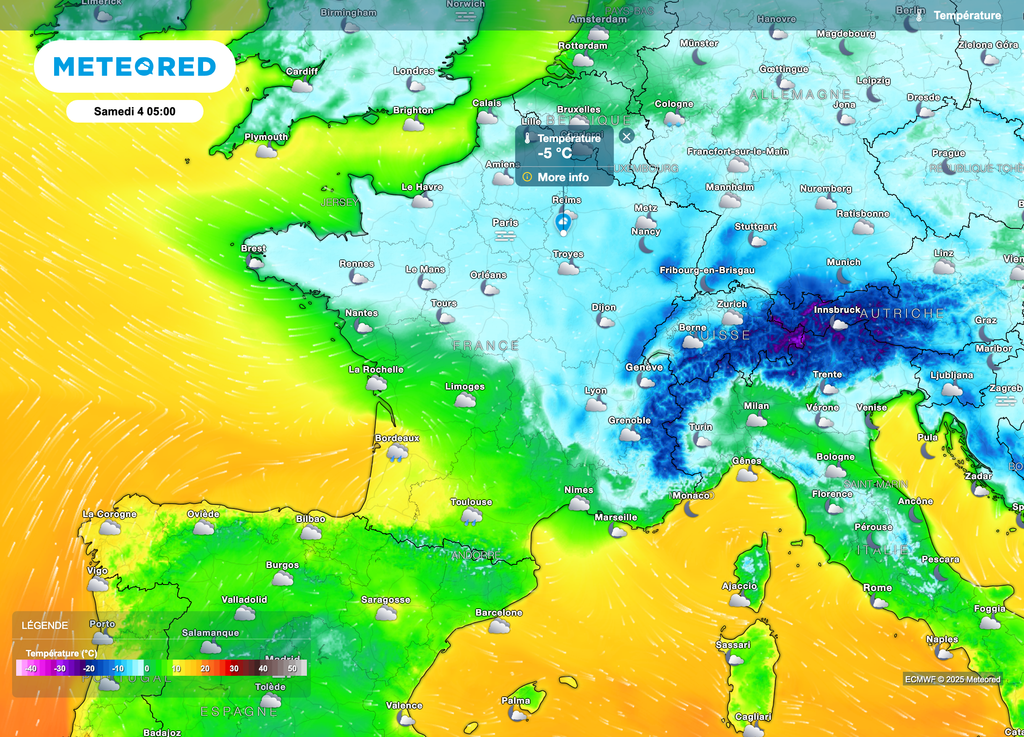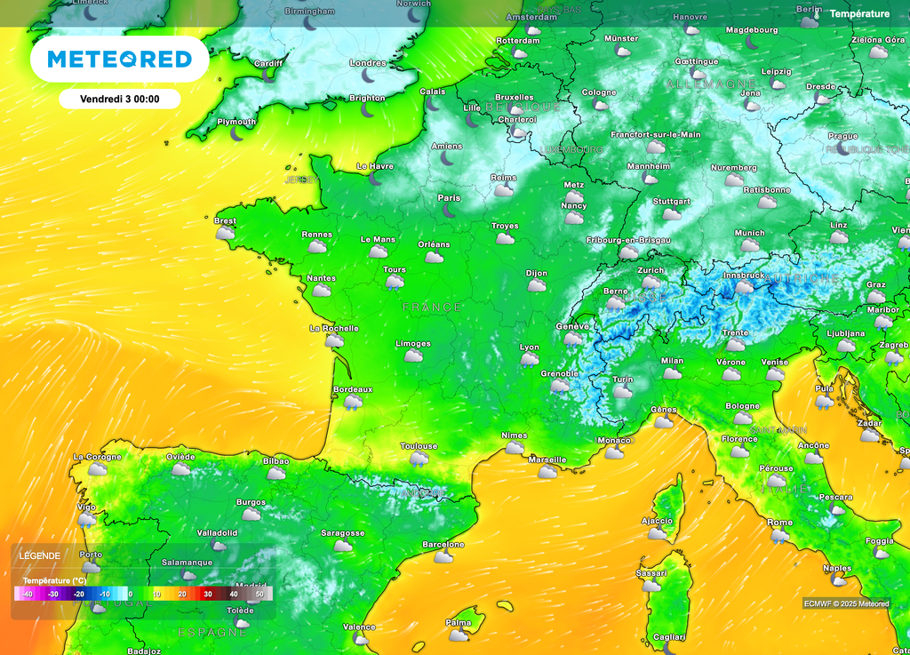 Seul le quart sud-ouest et le pourtour méditerranéen devraient rester à l'écart de ce froid. Des valeurs bien douces seront présentes vers le Pays-Basque avec par exemple 10°C samedi matin.