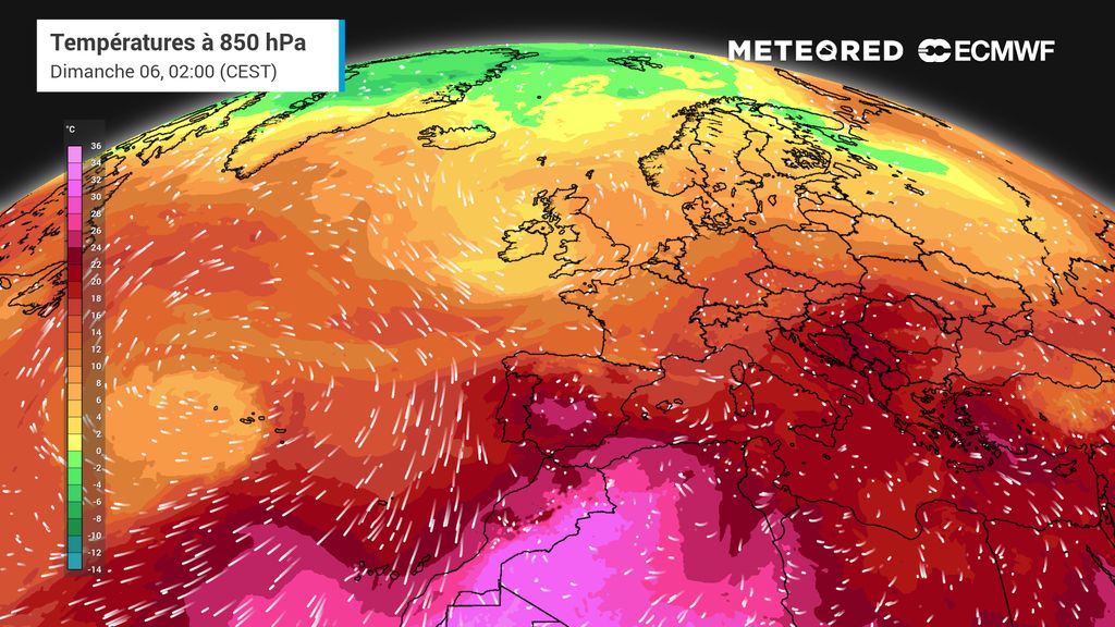 Il est prévu cet après-midi : 23 °C à Brest, 25 °C à Cherbourg, 30 °C à Biarritz, 31 °C à La Rochelle, 33 °C à Ajaccio, 36 °C à Nantes et Strasbourg, 37 °C à Lille et Tarbes, 38 °C au Mans et à Lyon, 39 °C à Paris, Orléans, Bourges, Bordeaux et Toulouse, et 40 °C à Nîmes.
