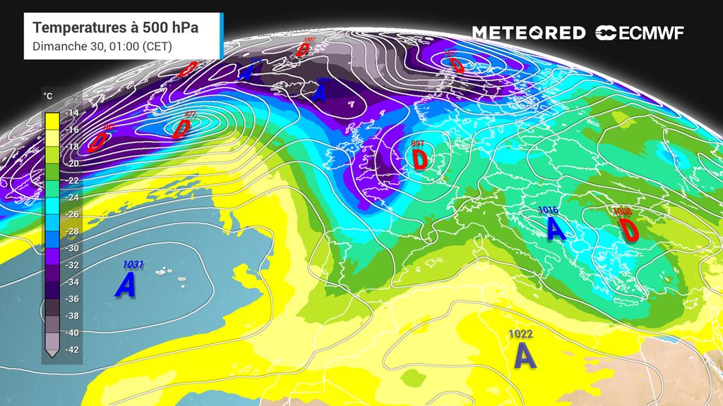 C’est typiquement dans ce genre de situation que des coups de vent peuvent affecter la France, et en premier lieu les régions de l’ouest puisque les basses pressions arrivent de l’Atlantique. Voilà pourquoi il conviendra de surveiller attentivement l'évolution des prévisions pour la première semaine de décembre qui sera rythmée par les pluies et les rafales de vent potentiellement tempétueuses. À suivre de près...