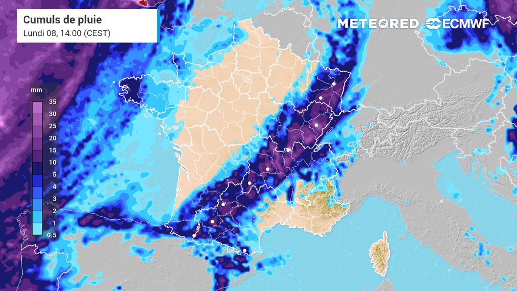Une météo plus agitée donc en raison d'un conflit de masses d'air parfois fort surtout entre mardi et mercredi. Un axe orageux actif se dessine depuis plusieurs jours : entre le Massif Central et l'Alsace-Lorraine, parfois jusqu'à 1 mois de pluie sont annoncés.